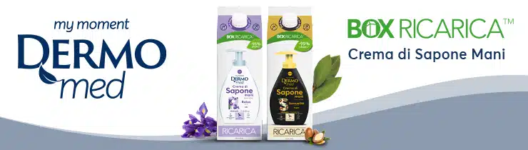 La BOX RICARICA di sapone mani Dermomed è realizzata in materiale a prevalenza cellulosica e permette di risparmiare il 95% di plastica rispetto a tre